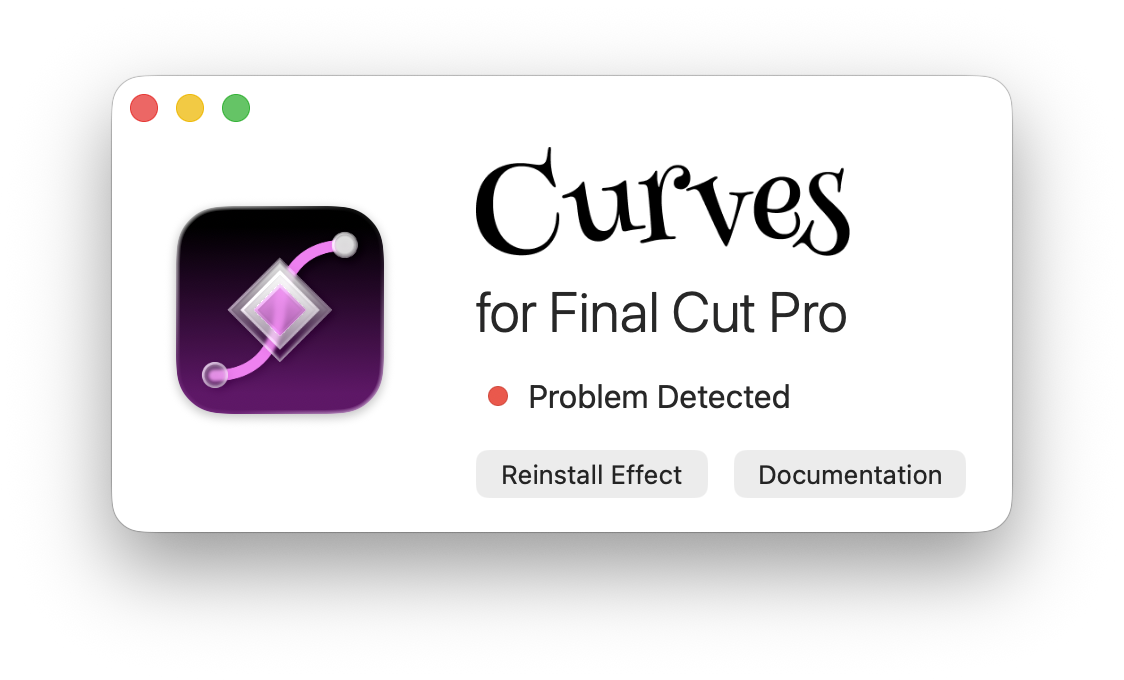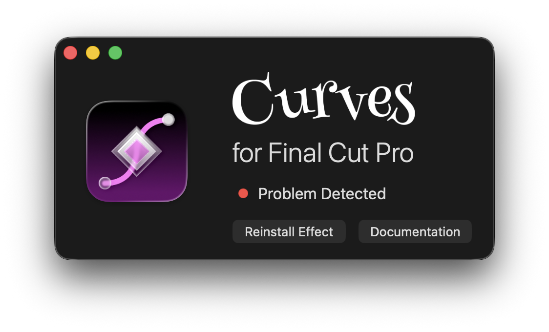 If you see a "Problem Detected" message in the Curves app, that means it wasn't able to install the Curves Motion Template to your Movies folder. This file is required for Final Cut Pro to detect the Curves plugin.