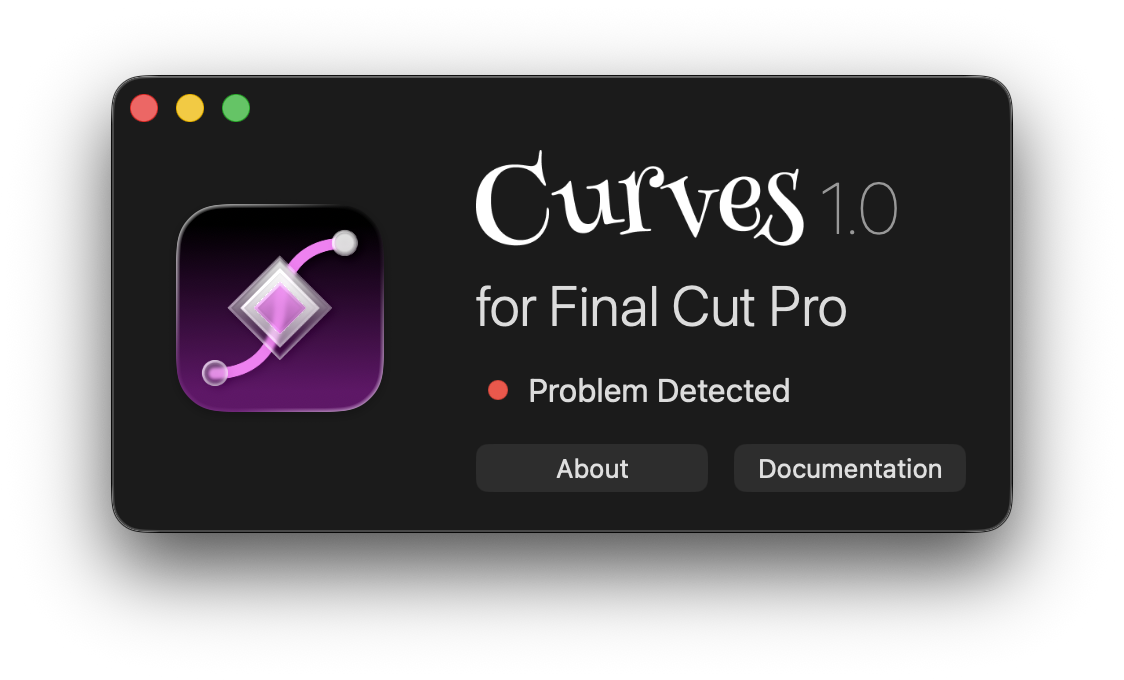 If you see a "Problem Detected" message in the Curves app, that means it wasn't able to install the Curves Motion Template to your Movies folder. This file is required for Final Cut Pro to detect the Curves plugin.